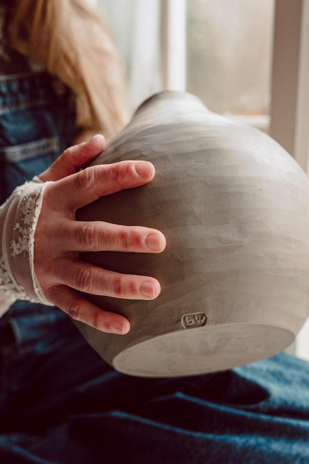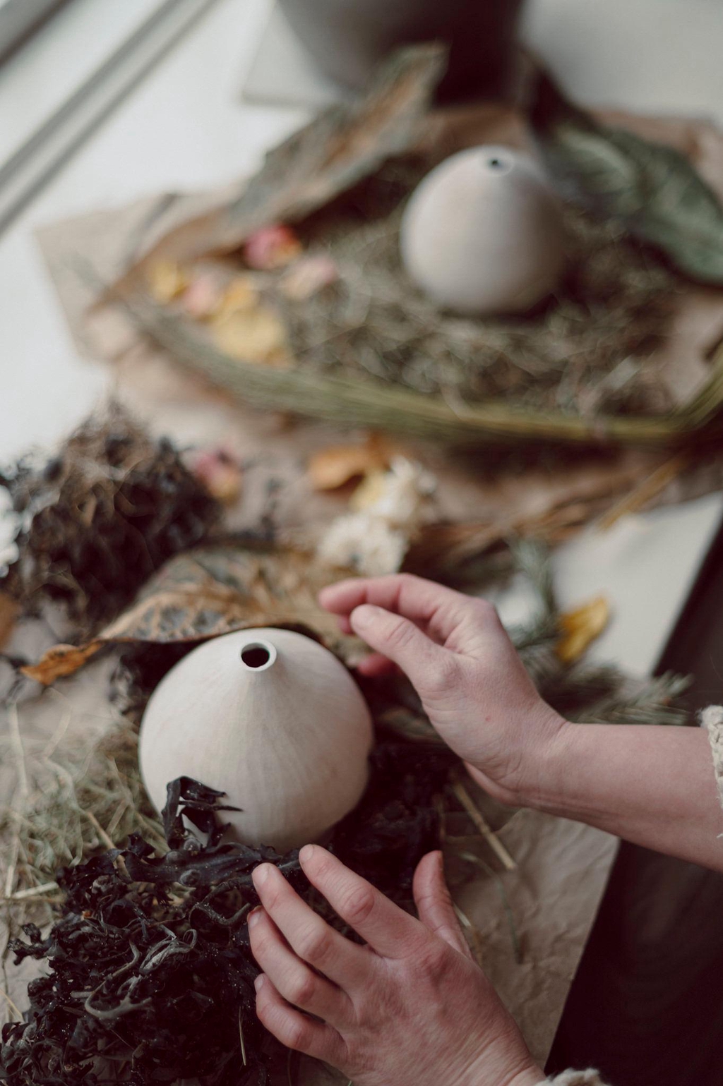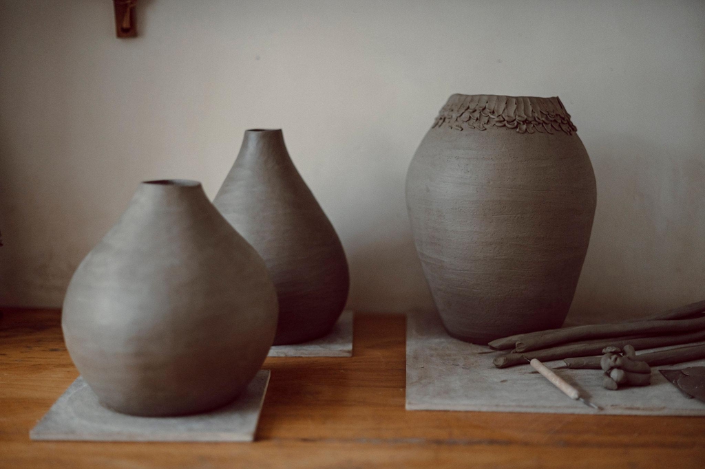 I work in my little home studio in Harrold, Bedfordshire, but I mainly fire my collections nestled in the Welsh hills near Llanafanfawr at my Great Aunts old farm cottage, a place which is very close to my heart.